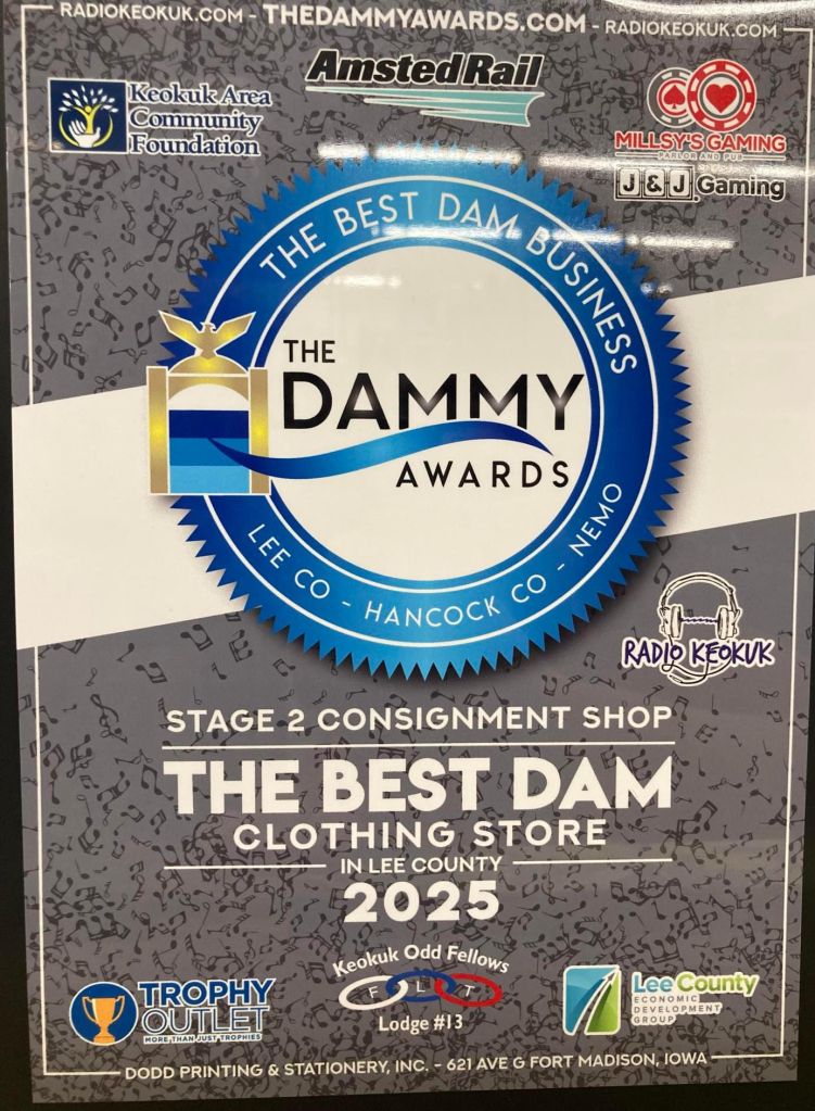 Thank you for your votes on the Dammy Awards! You guys voted us best clothing store in Lee County Iowa 2025! We very much appreciate the love and support you all give us.